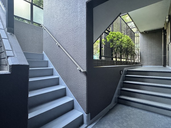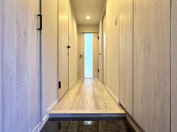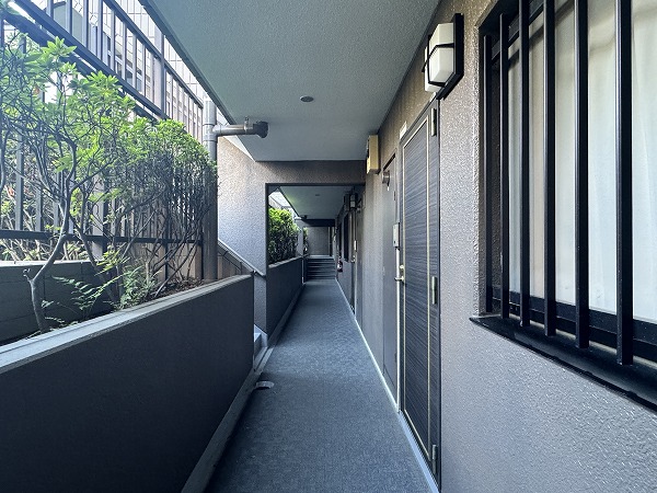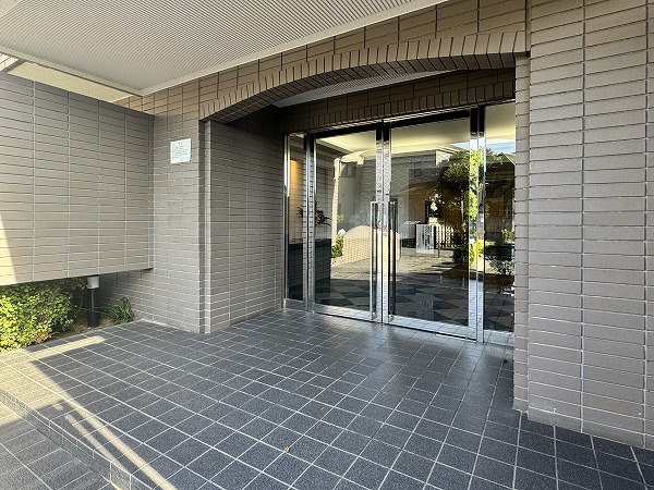 アプローチは道路から少し奥まった造り。段差のないスムーズな設計で、ベビーカーやスーツケースでも安心して通行できます。