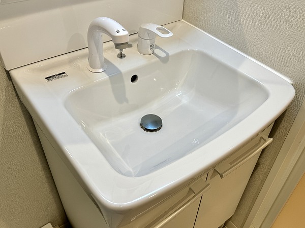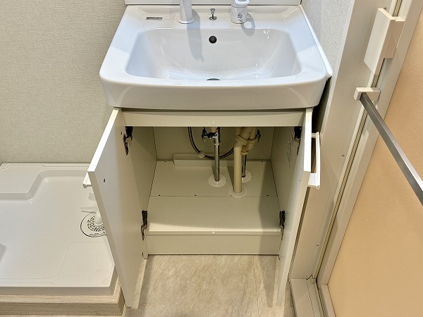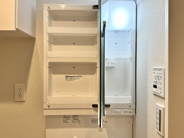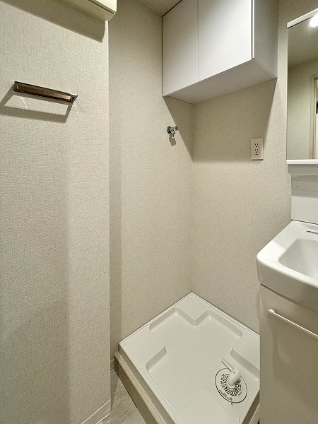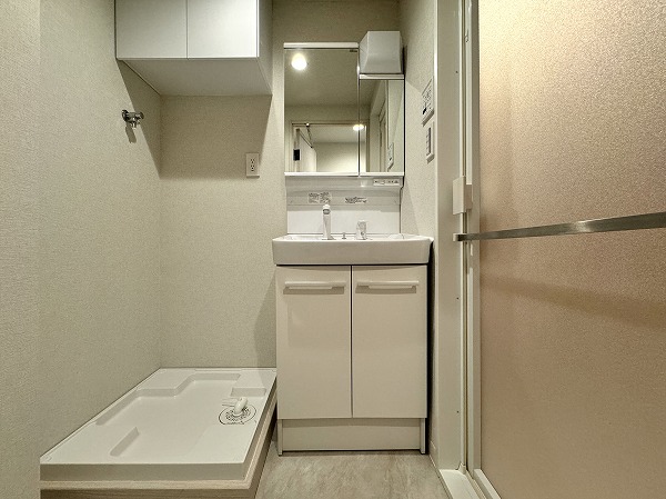 独立洗面台・洗濯機置き場・バスルームがまとまったサニタリールーム。清潔感のあるシンプルデザインで、朝の支度もスムーズです。洗面台や洗濯機上の収納スペースには、洗剤やタオルをすっきり整理できます。