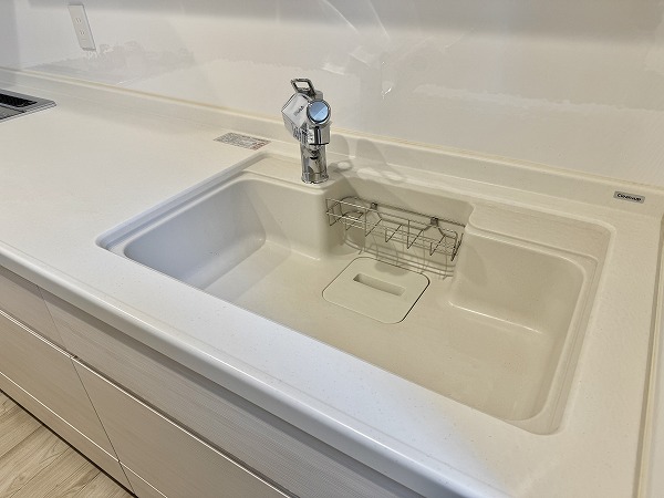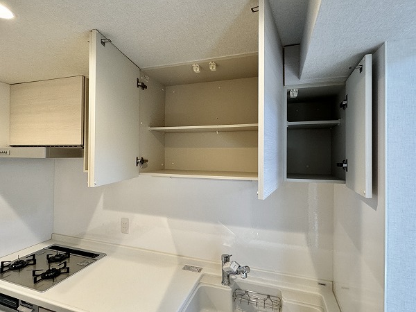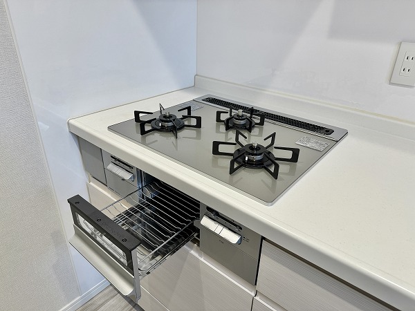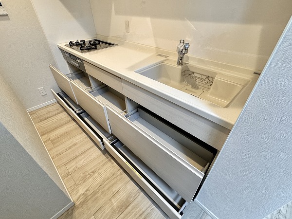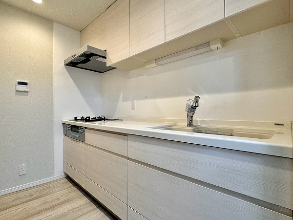 収納たっぷりのシステムキッチンはメインルームの奥まった位置にあり、匂いや煙が広がりにくいのが嬉しいポイント。ビルトインコンロ付きでお掃除もスムーズです。広めのワークトップでは、下ごしらえや盛り付けもゆとりをもって行えますよ♪