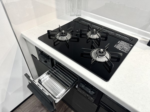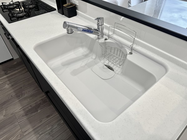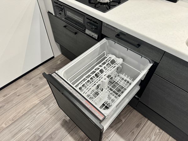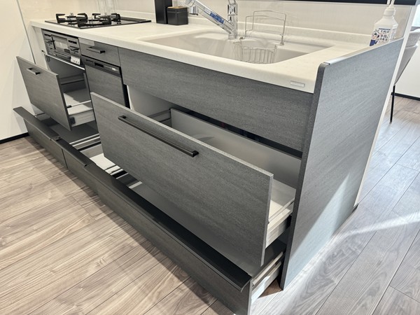 キッチンは解放感抜群のペニンシュラ型のレイアウト。キッチンに居ながらにしてLDKを見渡すことができるので、料理や洗い物をしながら家族団らんをお楽しみいただけます。背面にはゆったりとスペースが設けられており冷蔵庫やカップボードを設置できるようになっていました。