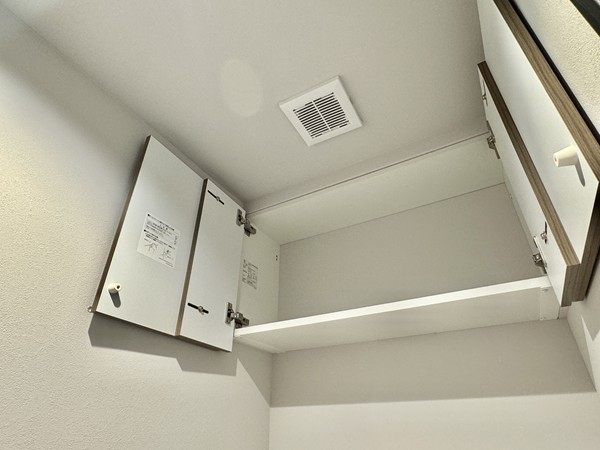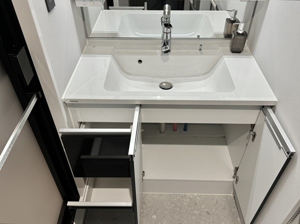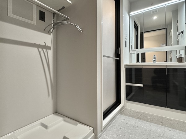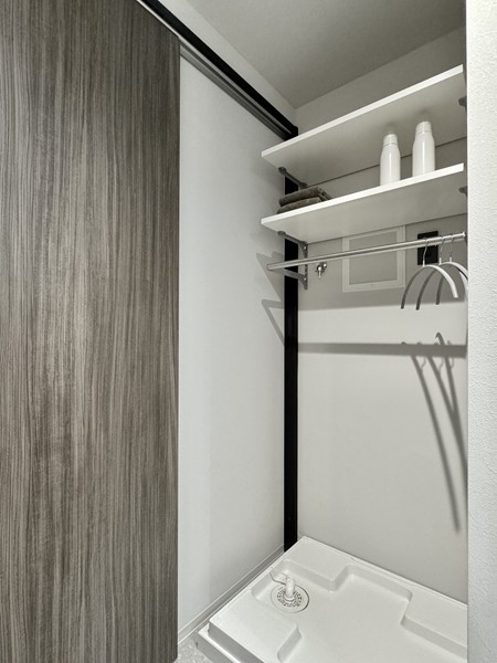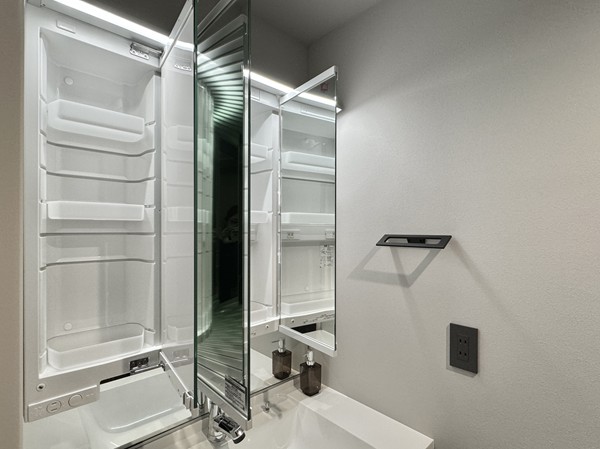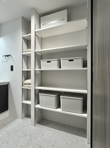 サニタリールームには、洗濯機置き場、洗面化粧台、バスルームが集結していました。洗面化粧台のミラーキャビネットや引き出しに加え、ランドリーの正面に大きなオープンシェルフが完備され水回り用品の収納場所には困りません。