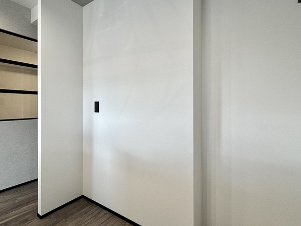 2つの窓の間にはオシャレな壁面収納が取り入れられていました。淡いグレーのアクセントクロスとブラックの棚板が相性バッチリですね。ちょっとした本棚として活用したり、文房具や日用品をオシャレなケースに入れて飾るように収納したり、茶葉やコーヒーにお気に入りのマグカップを並べてカフェスペースにしたり…。可能性無限大です。