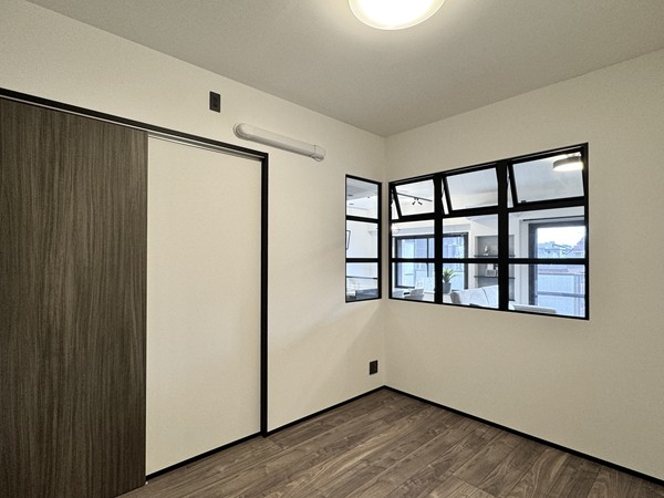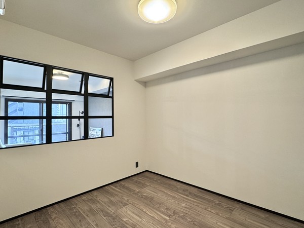 実際にお部屋を見てみて一番印象的だったのは、メインルームと約5帖の洋室を隔てる壁に設けられた格子窓。ブラックのフレームがオシャレですよね。こちらの洋室は居室の中で唯一外に面する窓が無いお部屋ですが、室内窓があるおかげでかなり開放的な空間に♪