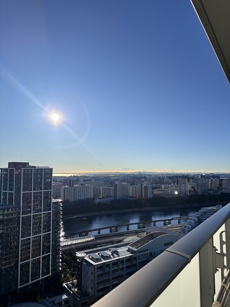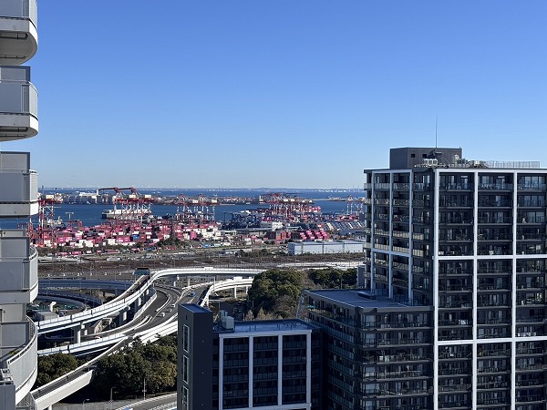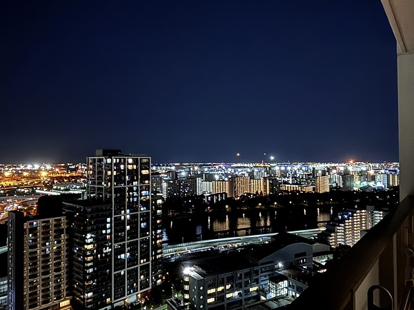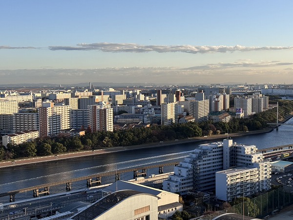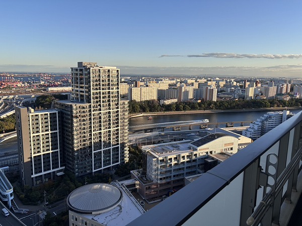 視線を外へ向けると、空と街が溶け合う開放的な景色。行き交う飛行機や船、線路を走る電車が小さく見え、都市の鼓動を遠くに感じられます。昼は青空が広がり、夜は光が瞬く幻想的な表情に。高層階ならではの特権ですね✧