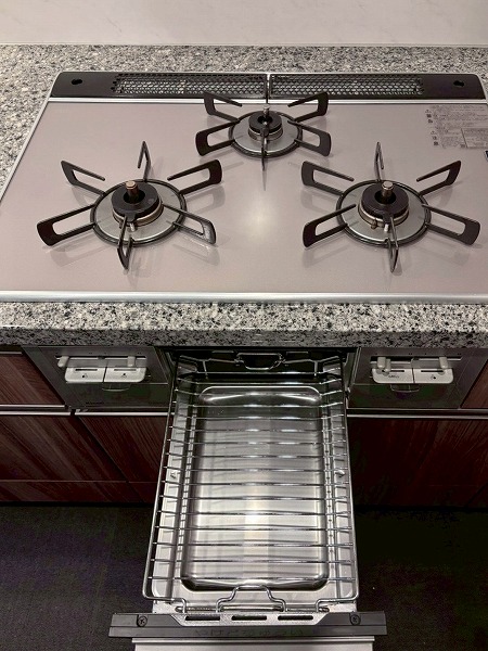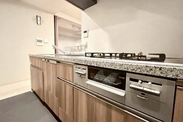 温もりある木目調デザインが印象的な約3.2帖のキッチン。スペースにゆとりがあり、ご家族で並んでの調理も可能で、グリル付き3口コンロで同時調理もスムーズ。食洗機やディスポーザーも備わり、日々の家事負担を軽減してくれますよ。