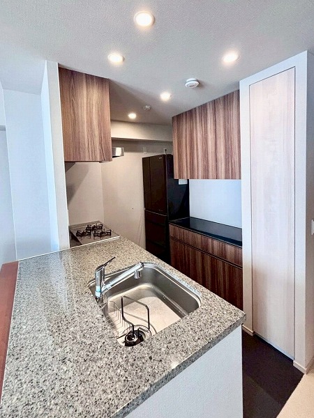 メインルームは約10.0帖。整った形状で家具配置がしやすく、シンプルな内装はさまざまなインテリアテイストと相性良好◎隣接する洋室の扉を開放すれば広々とした一体空間としても利用でき、ライフスタイルに合わせた柔軟な使い方が叶います。26階ならではの開放的な眺望も魅力で、バルコニーの先には飛行機や船、電車を望むダイナミックな景色が広がります。昼の爽やかな空と夜のきらめく光景、そのどちらも日常の一部に・・・♡キッチンは温もりある可愛らしい木目調デザインが印象的。家族と並んで調理できるゆとりがあり、グリル付き3口コンロで同時調理もスムーズです。食洗機やディスポーザーも備わり、忙しい毎日の家事をサポートしてくれますよ。