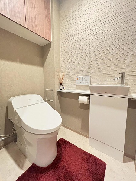 清潔感のあるトイレスペースには温水洗浄付き便座を採用。寒い季節でも快適な使い心地です。収納棚付きでトイレットペーパーのストックをすぐ手の届く位置に置いていけます。さらに手洗いカウンターを設置し、機能性と利便性を兼ね備え、来客時にも配慮された設計です。