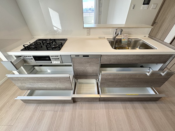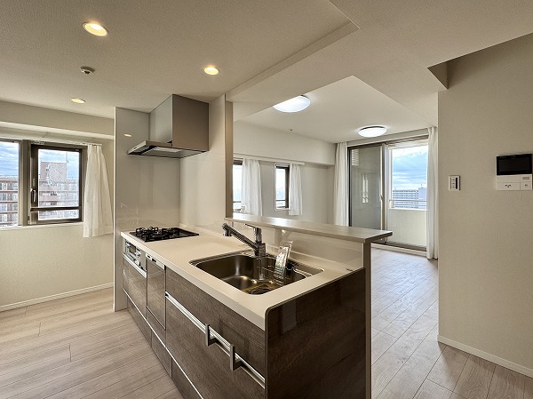 ご紹介するのは13階部分の3LDK。専有面積74.02㎡で、約14.9帖のLDKが住まいの中心です。バルコニーに面した窓から視線が外へ抜け、上階ならではの明るさと開けた眺めが広がります。リビングダイニングスペースには床暖房が備わり、寒い季節でも足元からやわらかく室内をあたためてくれます。