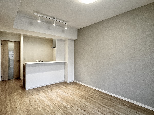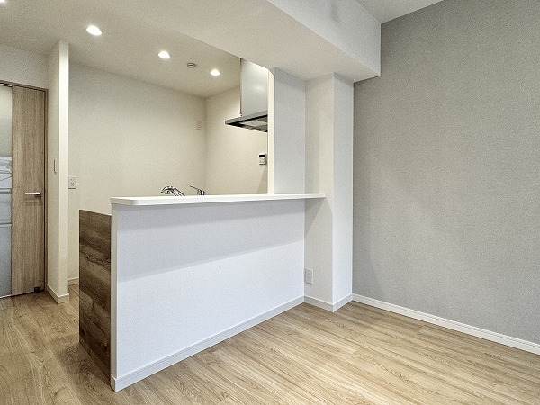 ご紹介する3LDKのお部屋はリノベーション済みで、隅々まできれいな印象✧約11.5帖のリビングダイニングキッチンは淡いグレーのアクセントクロスでモダンな印象に仕上げられ、ナチュラルモダンな空間です。