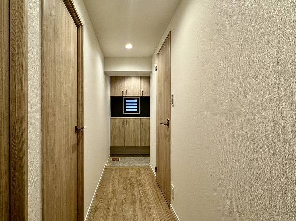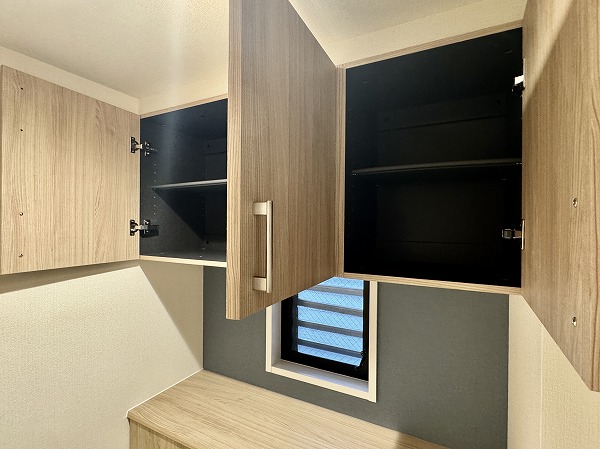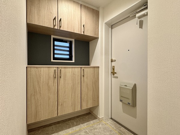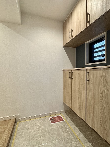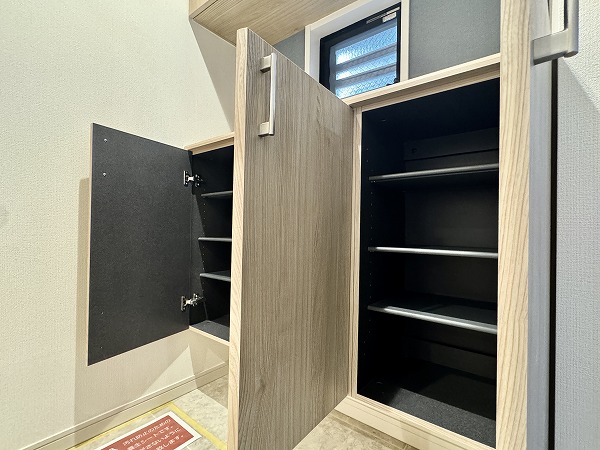 小窓付きの玄関は閉塞感を感じさせない明るい空間。靴箱は上下の収納に分かれており、日常使いの靴から季節物に応じて収納を使い分けられます。