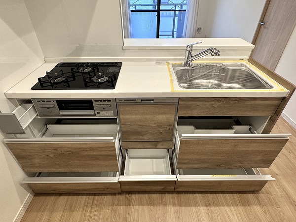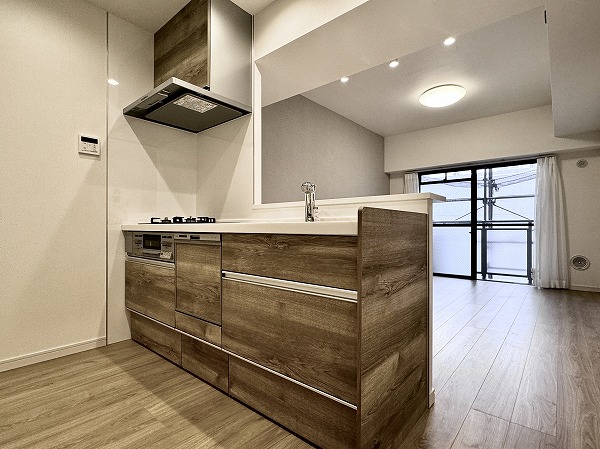 フローリングと同系色の木目調キッチンはお部屋全体に統一感をもたらします。背面スペースに余裕があり、冷蔵庫やカップボードの配置も思い通りにできそうです◎