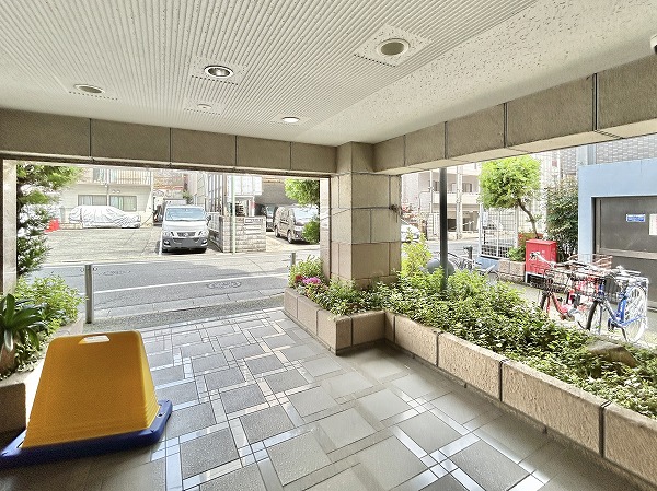 緑に囲まれたアプローチを歩くと、マンションのエントランスへと導かれます。奥まった設計で静かな印象を与え、居住者のプライバシーをしっかりと保護◎庇も大きく設けられ、日傘を準備したりできるのが嬉しいポイントです。