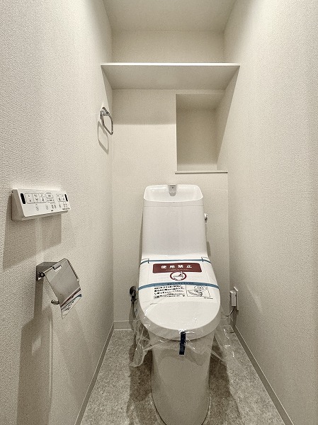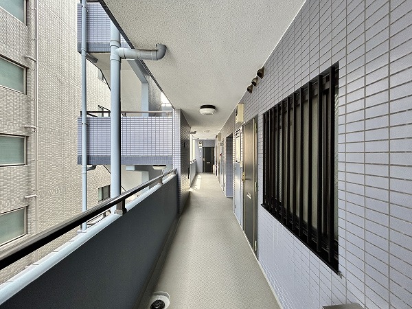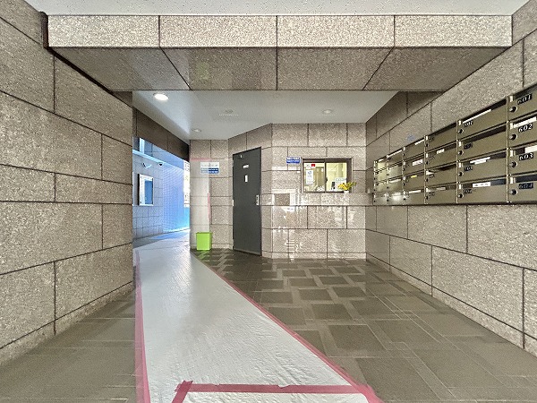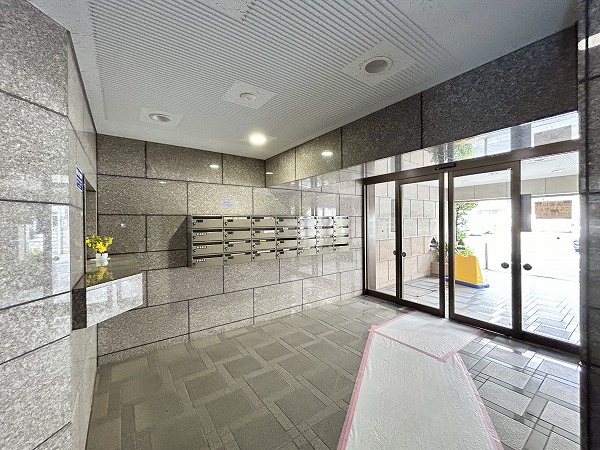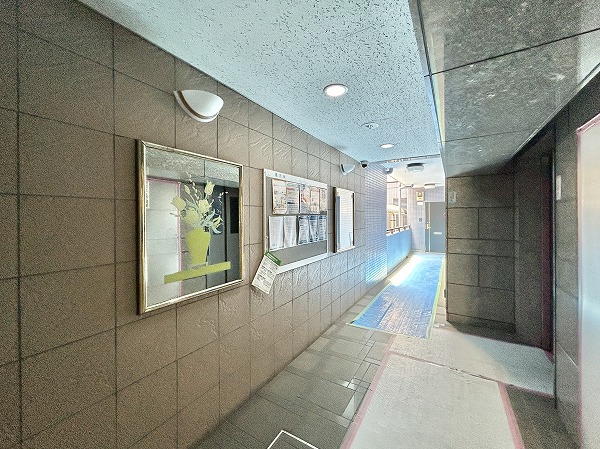 エントランスは上品なタイル貼りデザイン。フラットな設計で、ベビーカーや車いす、台車を押す配送業者もスムーズに行き来できます。また、管理人室や防犯カメラも完備され、安全性に配慮された共用空間です。
