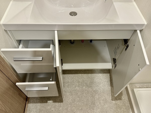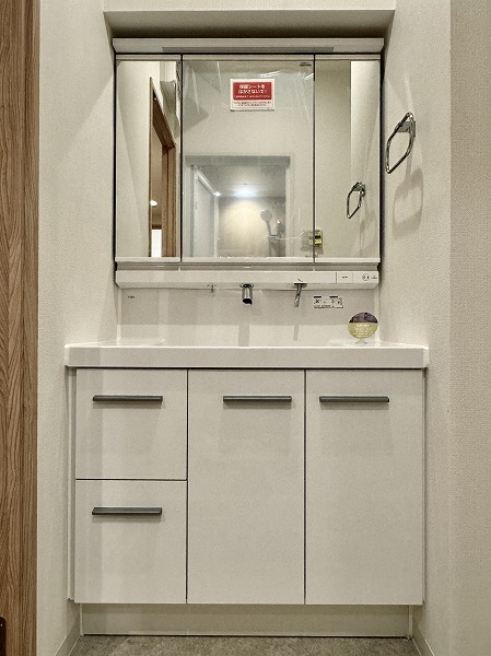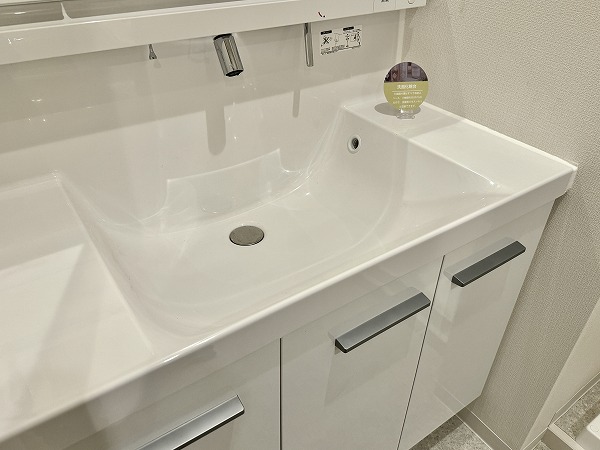 清潔感たっぷりのホワイトを基調にしたサニタリールームは、洗面台・洗濯機置き場・バスルームがまとまっていました。家事の動線が良く、快適に使える設計です♪