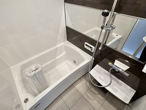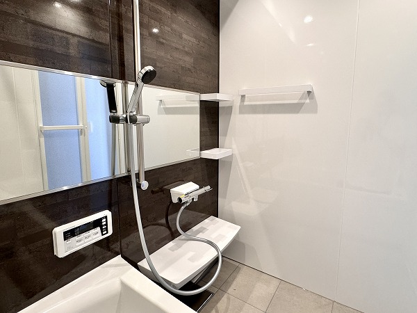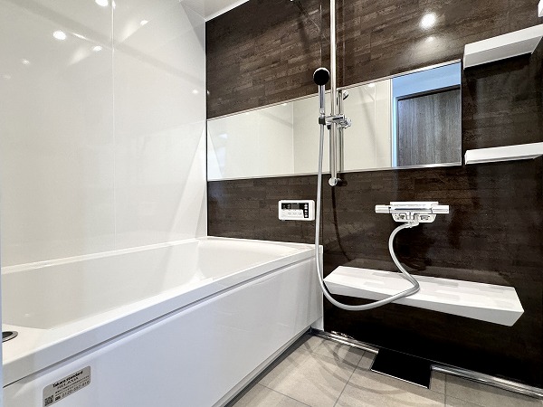 落ち着いたダークブラウンのアクセントパネルが印象的な浴室は、新規交換済み。追い焚き機能・浴室暖房乾燥機を備え、1年を通して快適な入浴時間をお過ごしいただけますよ♡