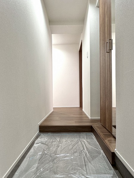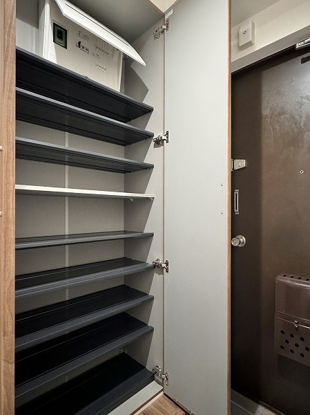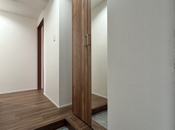 玄関から室内が直接見えないプライバシー性の高い設計。トールタイプのシューズクローゼットには姿見を備え、収納力・機能性ともに優秀。お出かけ前の身支度もスムーズです。