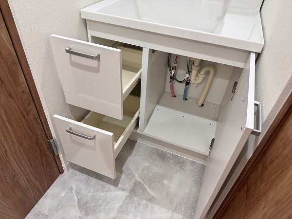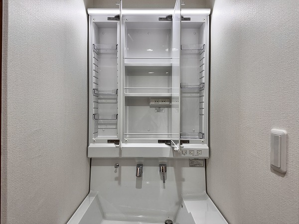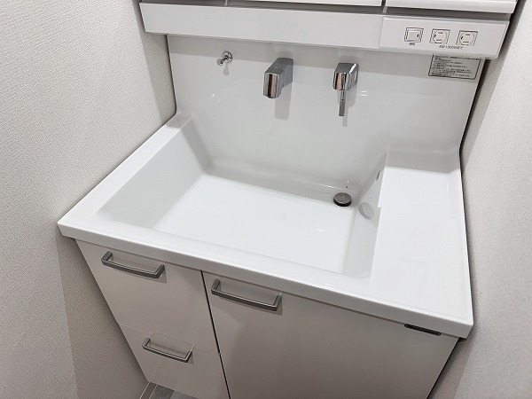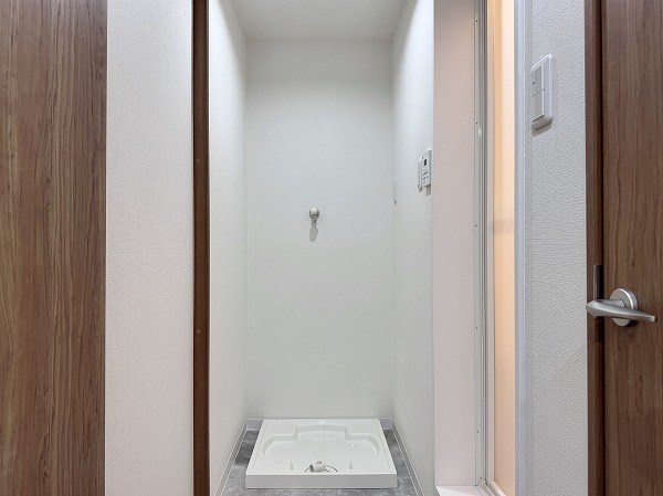 パウダールームには洗濯機置場・トイレ・洗面台・バスルームがひとまとまりに配置されており、動線がスムーズ。白を基調とした洗面台が空間に馴染み、明るく爽やかな印象です。