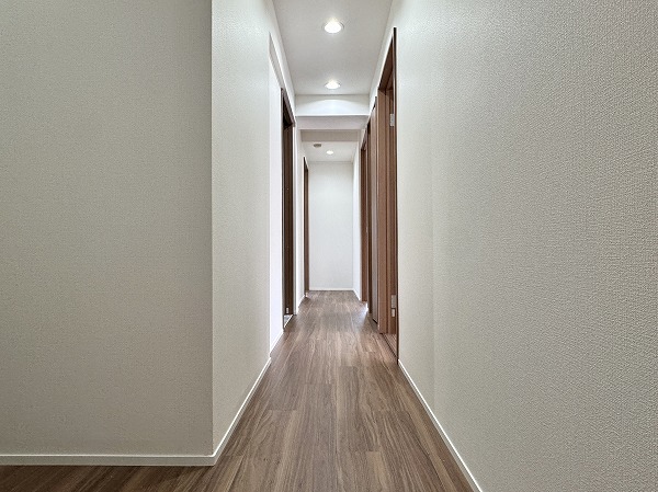 目的のフロアに到着したら、屋内型の廊下を通ってお部屋へ。雨風を気にせず移動できるのが魅力です◎廊下の突き当たりには窓があり、自然光が差し込む明るい共用スペースとなっています。