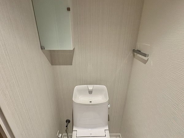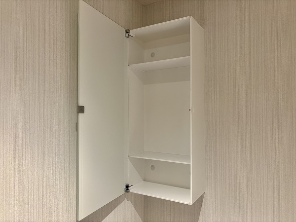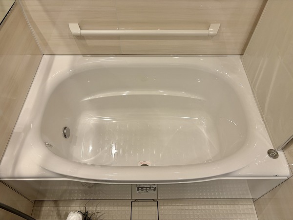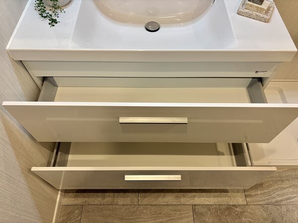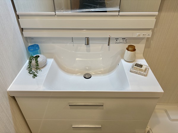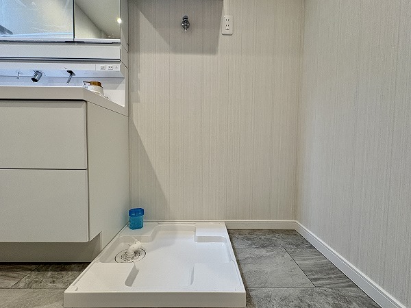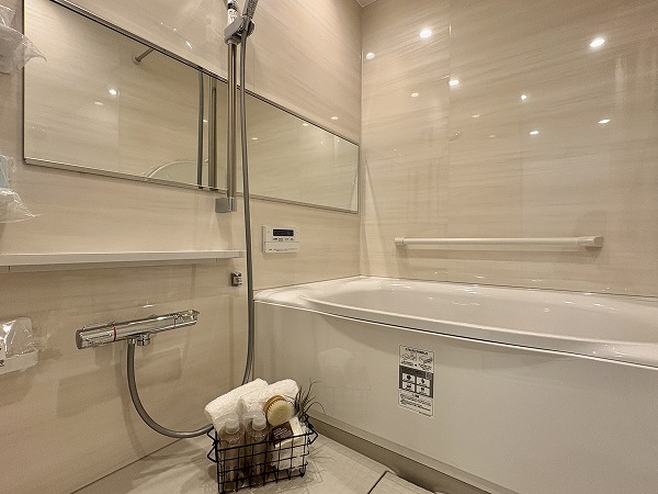 石目調のフロアタイルと白を基調とした壁が清潔感のあるパウダールーム。白い光で明るい室内は、身だしなみを整えるのには最適です。バスルームはベージュベースの色味で目に優しく、お風呂につかれば日々に疲れを癒してくれます。