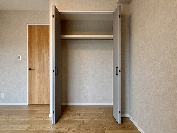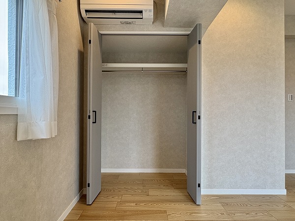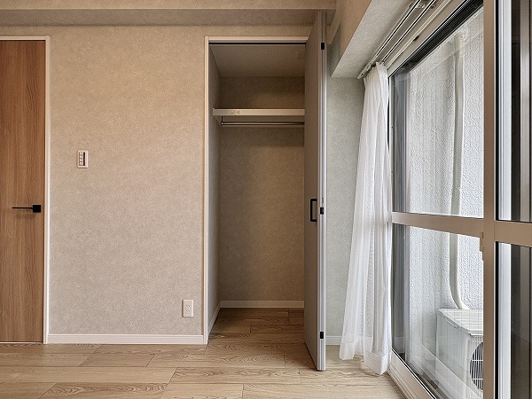 間取りは1LDK、専有面積は約50㎡。家具の置き方次第で、ひとり暮らしにも、ふたり暮らしにも柔軟に対応できそうです。約12帖のメインルームは大きな窓が取り入れられ開放感抜群。キッチンの背面にも窓があり、自然と視線が抜けて実寸よりも広々と感じられました。洋室は約5.5帖ほど。クローゼットが2面も設けられているため、衣類や生活用品を用途別に分けて収納しやすく、空間をすっきり保ちやすいのも魅力のひとつ。