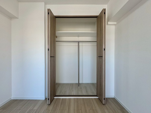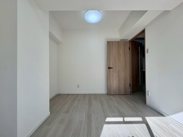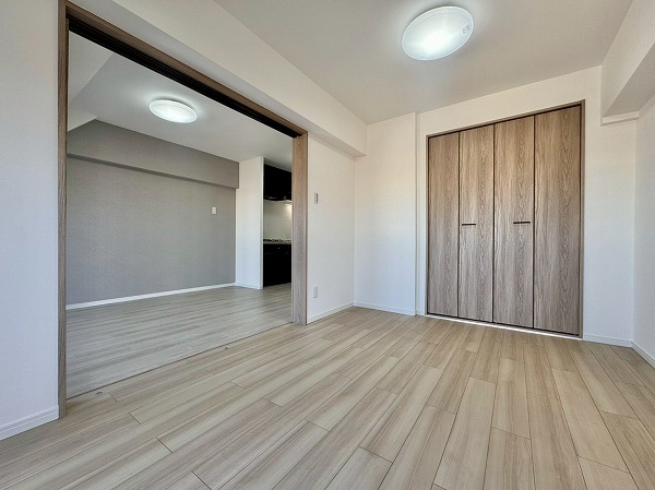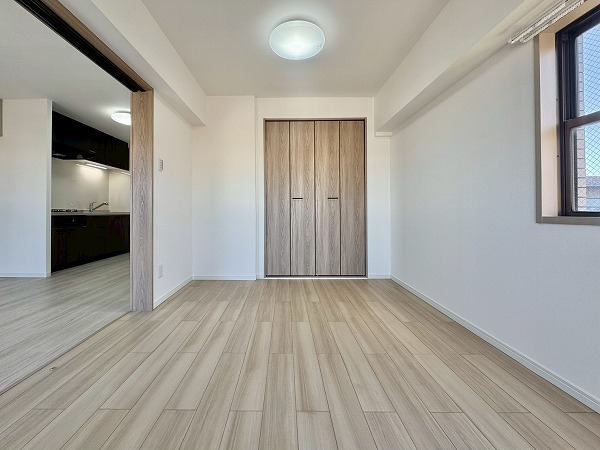 約6.0帖の洋室はリビングダイニングに隣接。2面採光で明るさを確保しながら、スライドドアで仕切られているため空間の使い分けがスムーズです。普段は開放してリビングを広く使い、必要に応じて個室として活用することも可能。クローゼット付きで収納面も安心ですね。