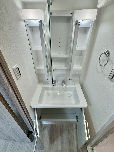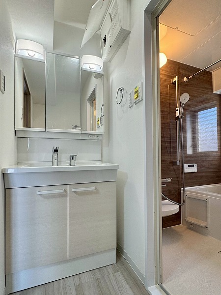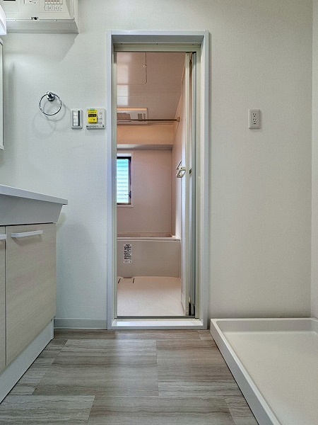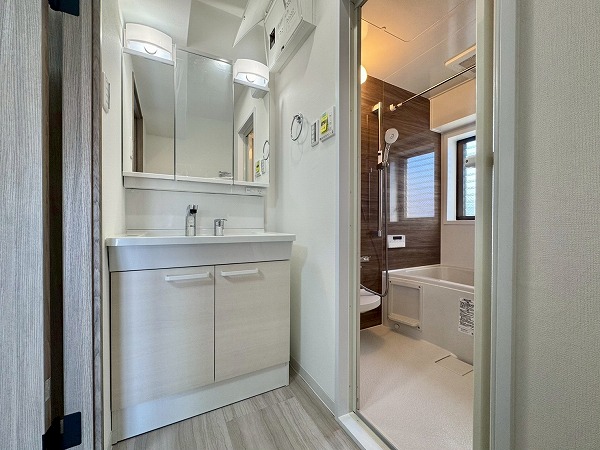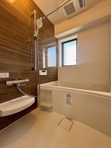 木目アクセントがやわらかな雰囲気をつくるバスルーム。小窓付きで空気の入れ替えがしやすく、すっきりとした空間を保てます。追い焚き機能があるのでゆっくり湯船につかりたい日にも安心♪浴室乾燥機付きのため、天気を気にせず洗濯物を干せるのも嬉しいポイントです!