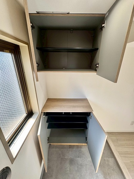 住まいに入って最初に目に入る玄関には、フロート施工のシューズボックスを採用。足元に抜け感が生まれ、空間を広く感じさせてくれます。カウンタータイプなので、鍵の定位置にしたり、季節の小物やウェルカムボードを飾ったりとインテリアを楽しめるのもポイント。