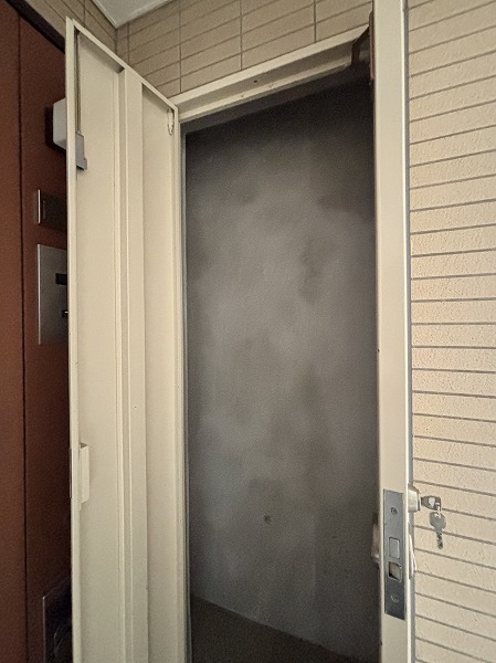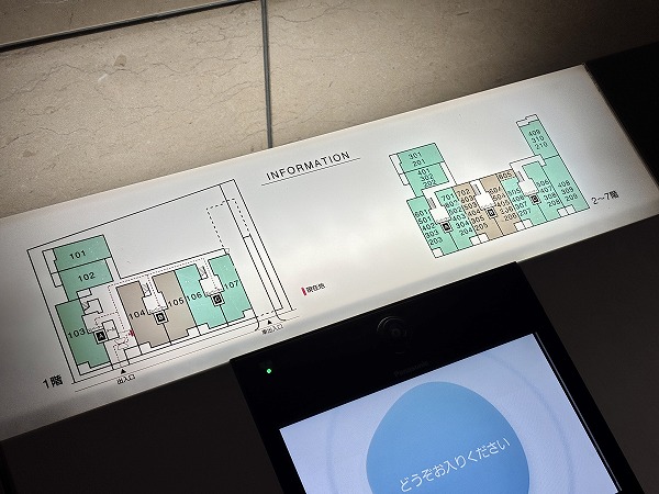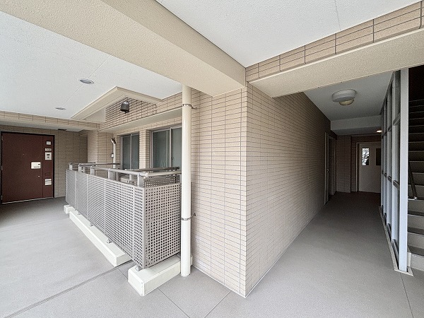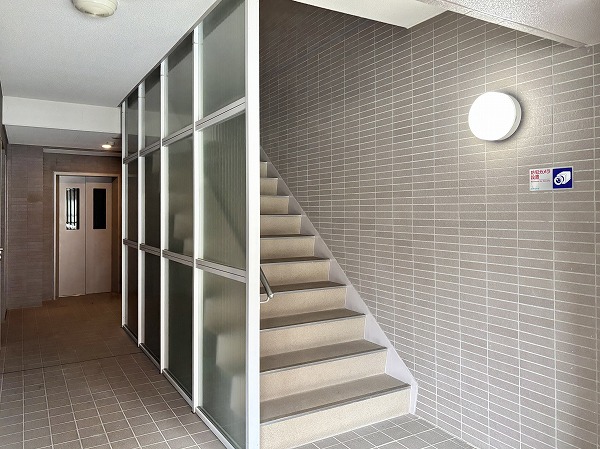 風通しの良い外廊下に玄関扉が並んでいます。エレベーターが3カ所にあり、お部屋によってどれを利用するかが決まっているようです。利用する人が減るので、混雑緩和が期待できそう。