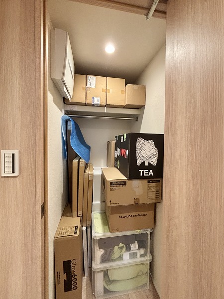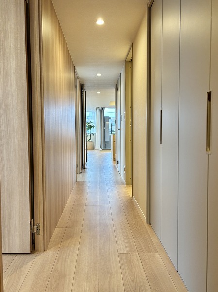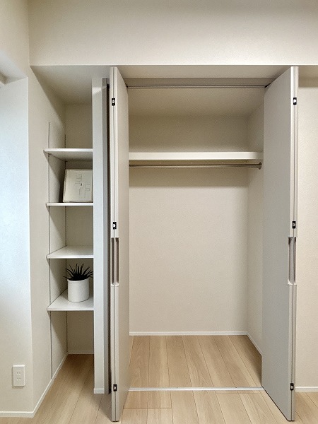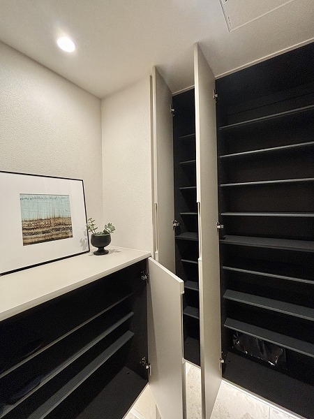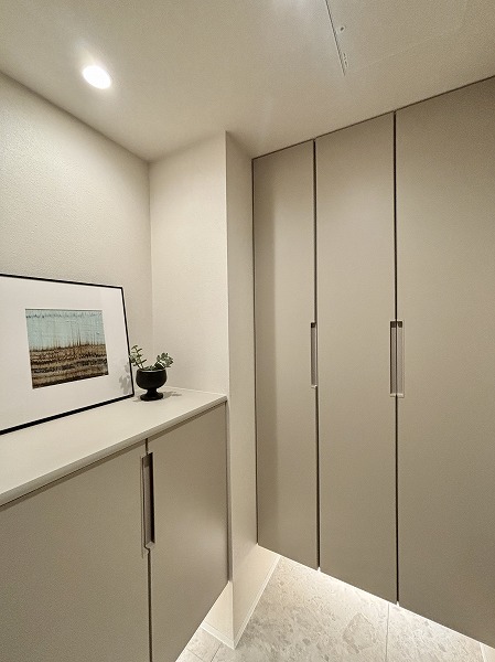 玄関や廊下にもたくさんの収納が。まず、アルコーブ部分にトランクルームをご用意しています。レジャー用品はこちらで保管くださいね。そしてシューズボックスはもちろん、廊下にはこちらの可動棚と大きなクローゼットをご用意。荷物の置き場所には困りません。