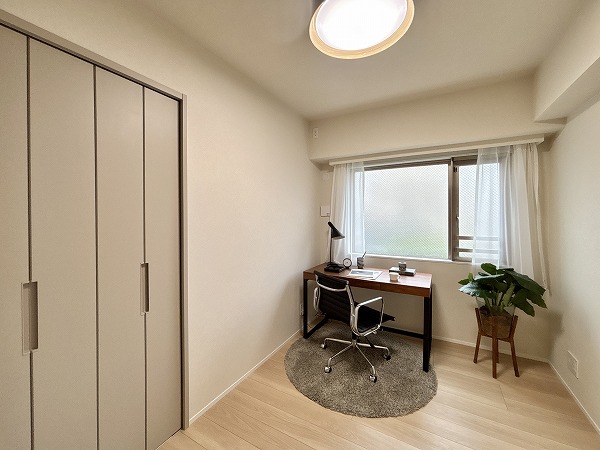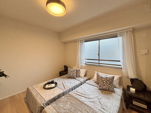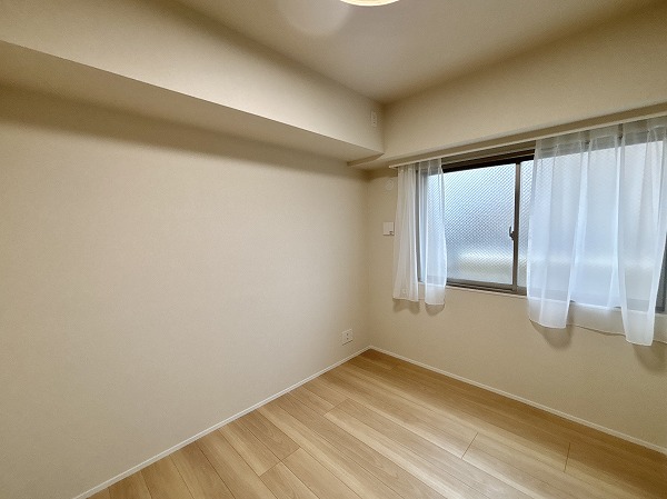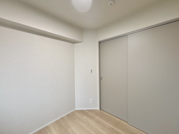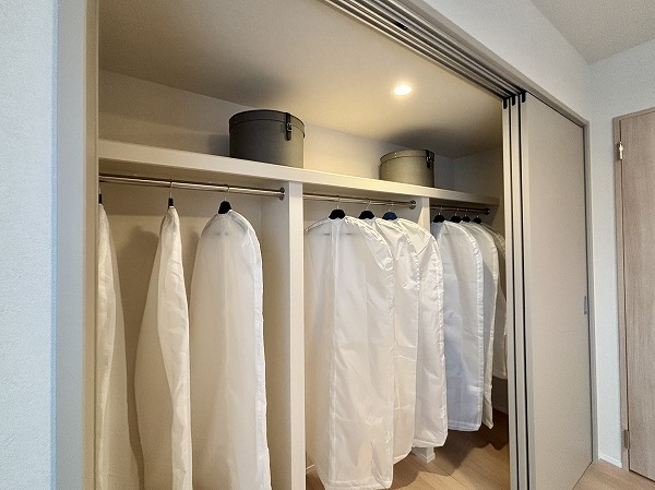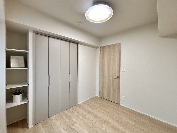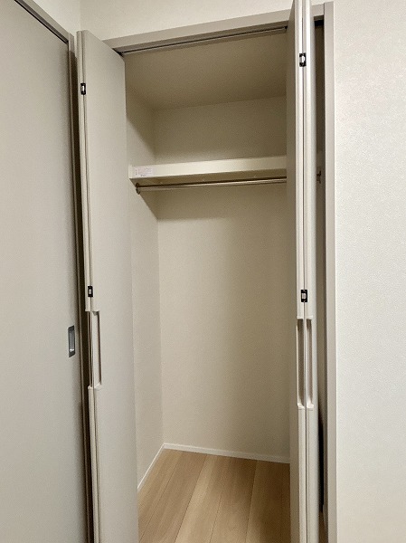 1番広い洋室はおよそ7.1帖。ベッドを2つ並べてもまだ余裕があるので、ご夫婦で使用する主寝室にオススメです。壁一面に横に長いウォークインクローゼットがあり、お洋服をたくさん保管できます。