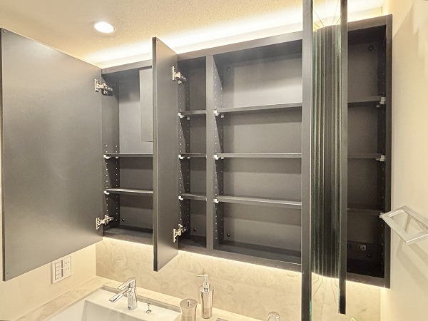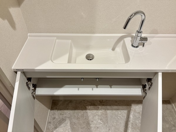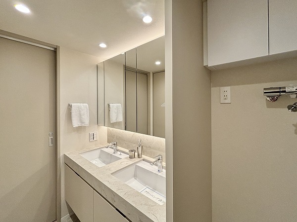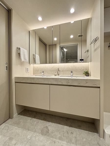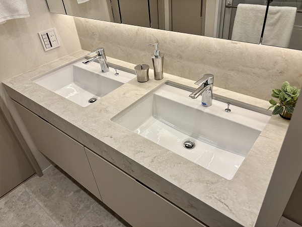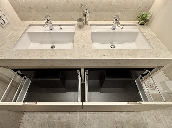 キッチン同様田中工藝製の洗面化粧台を採用しています。2ボウルタイプなのでご家族と並んでご使用いただけますね。これなら混み合う朝の時間帯もストレスを感じずに済みそう!