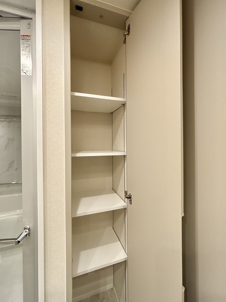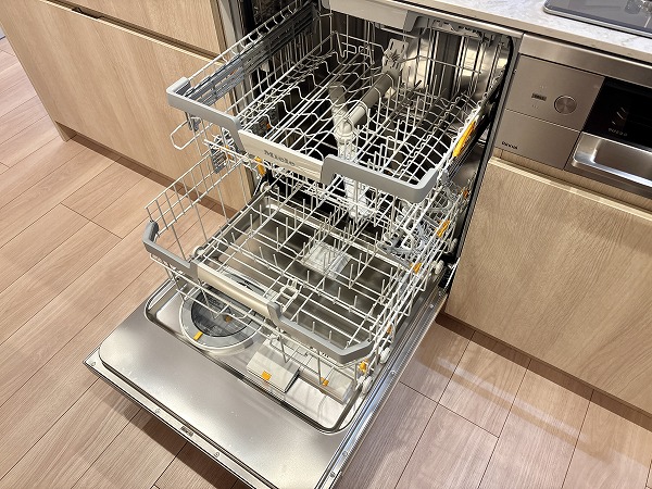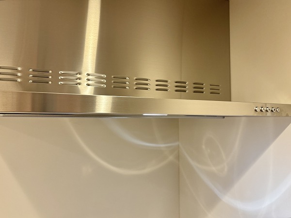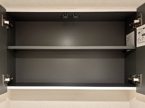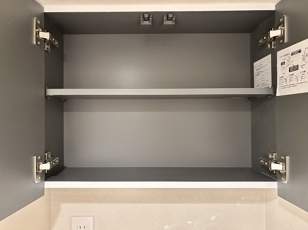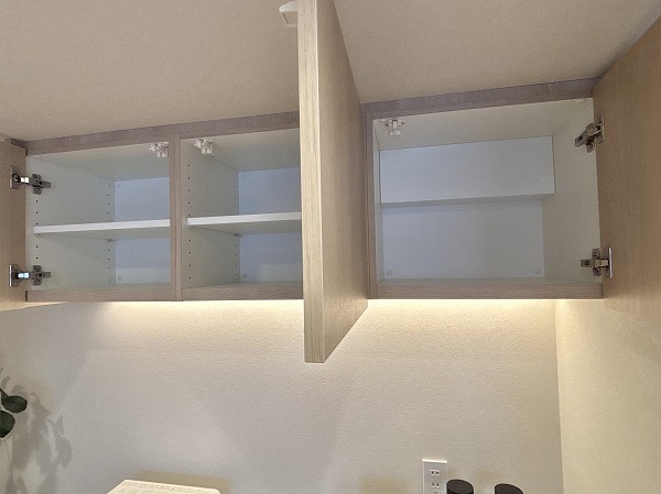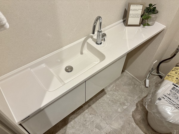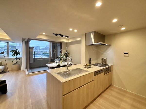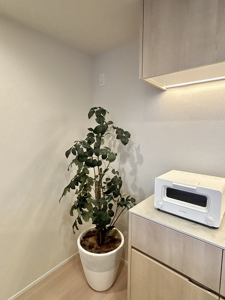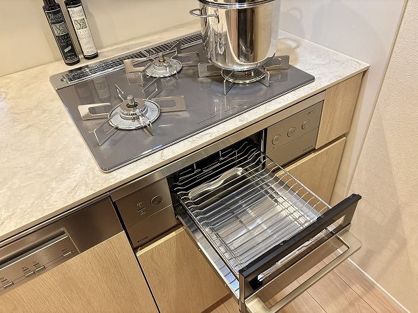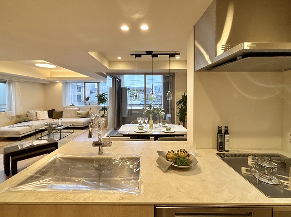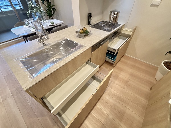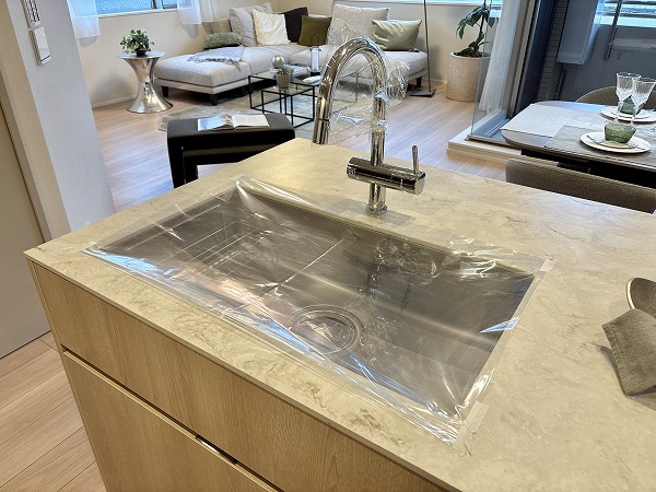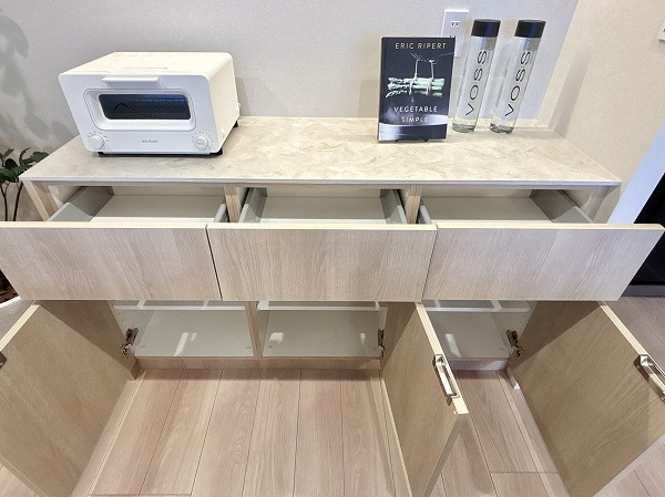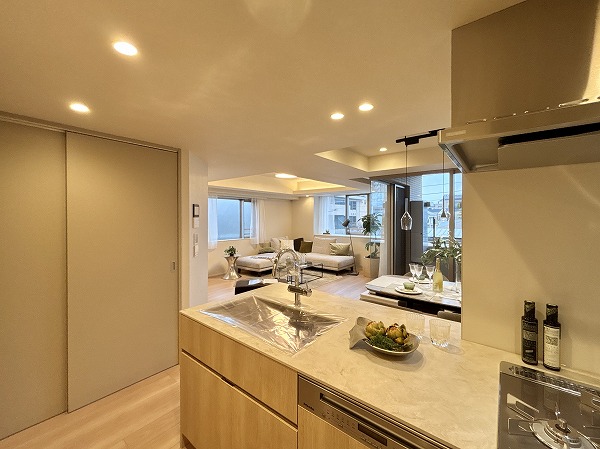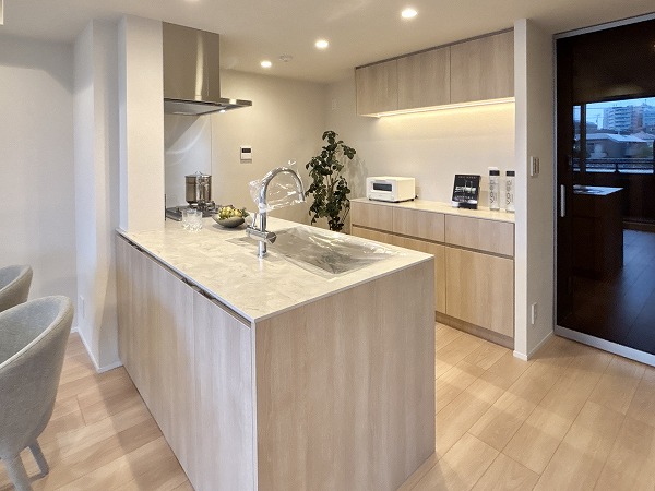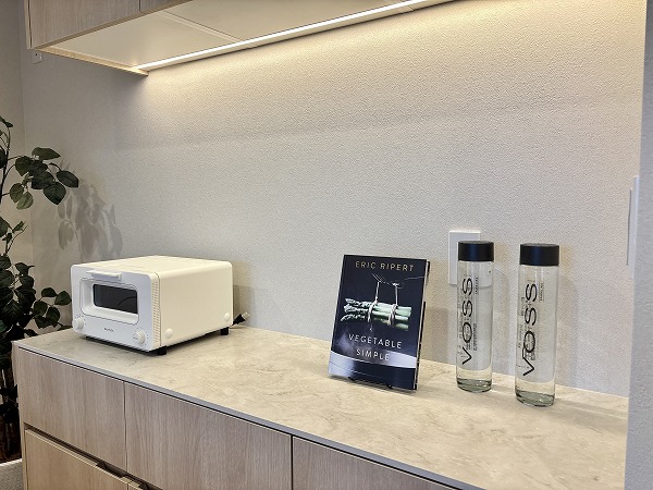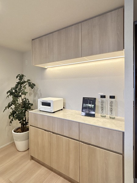 オーダー家具で人気が高い田中工藝製のシステムキッチンに新規交換されています。大理石調の素材が使用されたカウンターが美しいですね。背面には同じデザインのカップボードもあり、お皿やカトラリーをすっきり整頓できます。