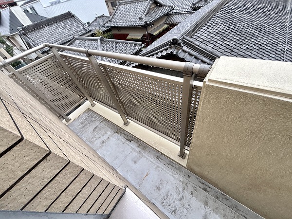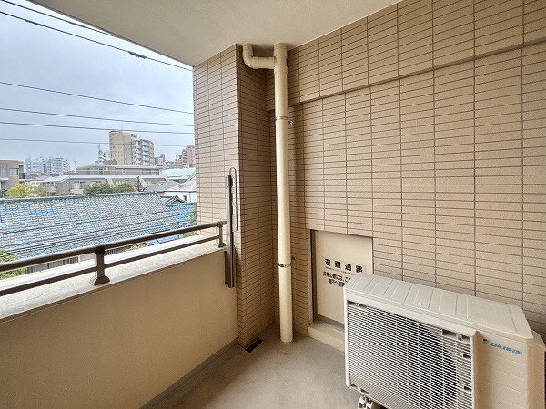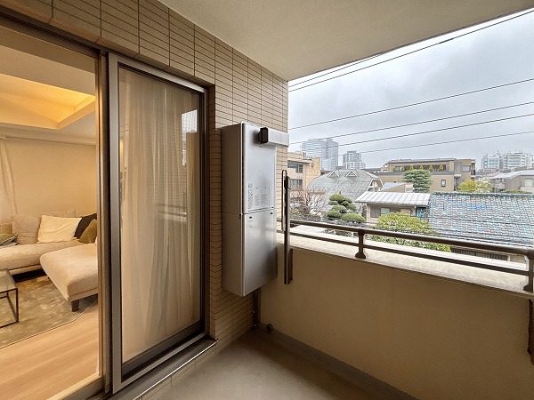 南東向きのバルコニーは6.34㎡。ややコンパクトなので、お布団やシーツなどのお洗濯物はバスルームの浴室換気乾燥機を使って乾かすのがオススメ。周囲に高い建物がないため、晴れた日には明るい光がしっかり射し込みます。