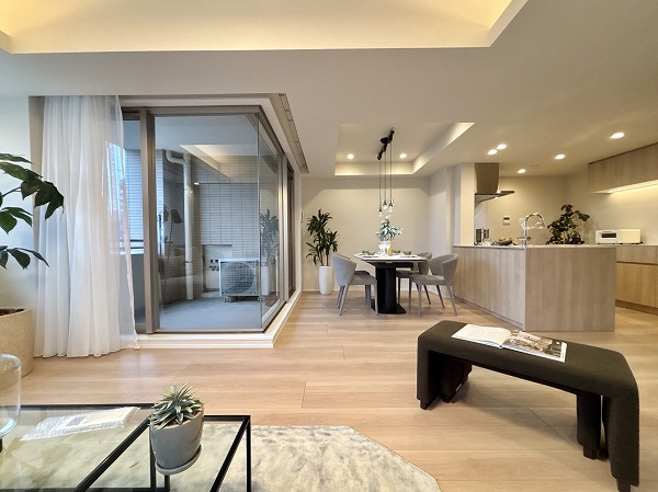 リビングダイニングキッチンはおよそ21.3帖。バルコニーに面した大きなコーナーサッシをはじめ3面に窓があり、より広く感じられました。お部屋自体の色合いはシンプルですが、ピクチャーレールでアートを飾ることで個性を出すことが可能です。