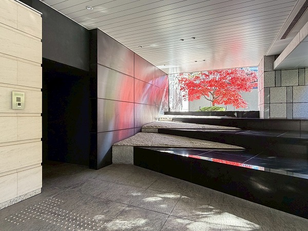 共用部には美しい紅葉、綺麗に整えられた植栽が広がっていました。帰宅時には一日の疲れをほどきながら、ゲストを迎えるときにはこの先に広がるホテルライクな空間への期待を高めてくれます。