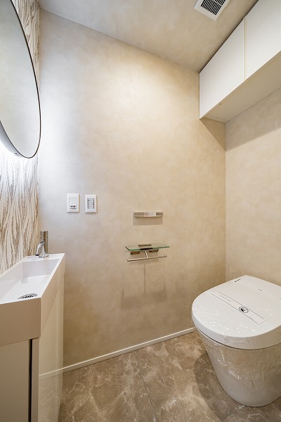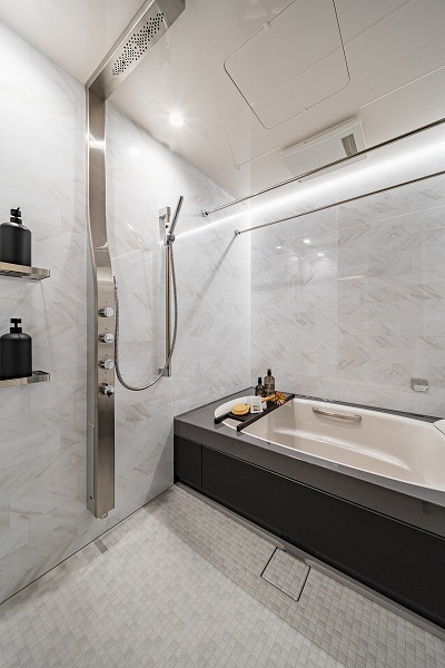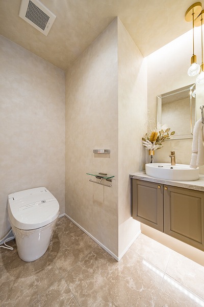 バスルームはLIXILスパージュが採用されています。追焚き機能&浴室乾燥機を搭載していて、快適性と実用性を両立。照明や質感も落ち着いており、単なる入浴ではなく「整う時間」を過ごせるバスルームです。