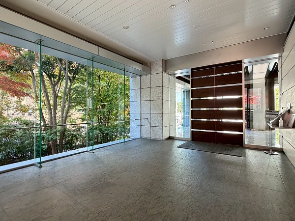 共用部には美しい紅葉、綺麗に整えられた植栽が広がっていました。帰宅時には一日の疲れをほどきながら、ゲストを迎えるときにはこの先に広がるホテルライクな空間への期待を高めてくれます。