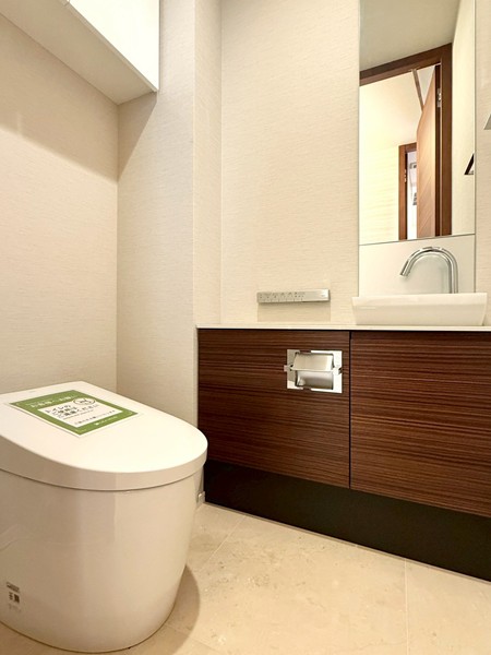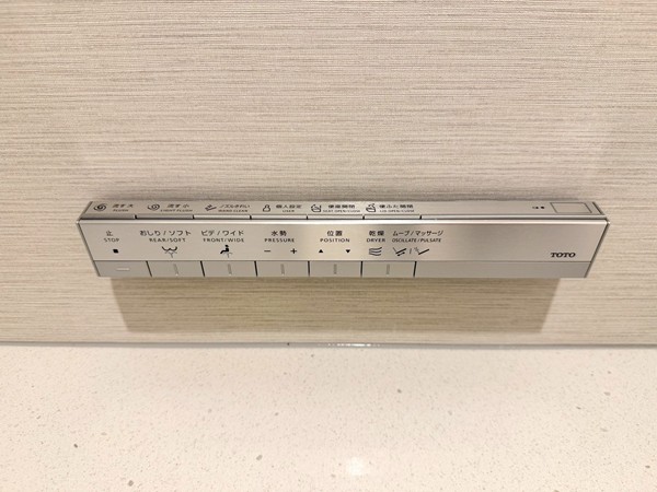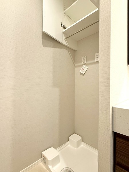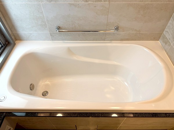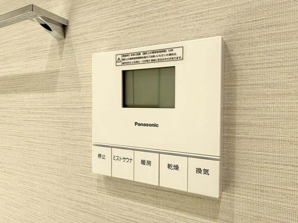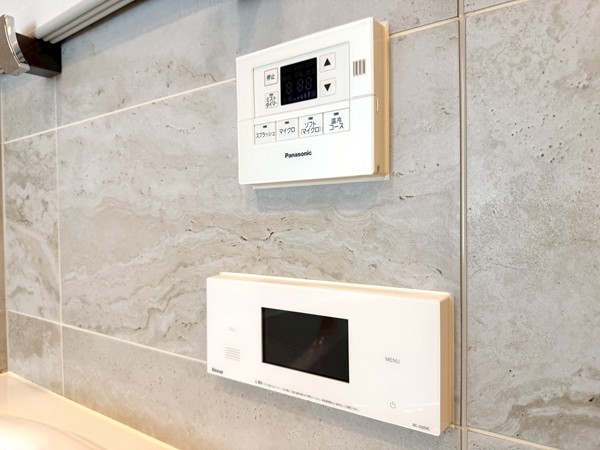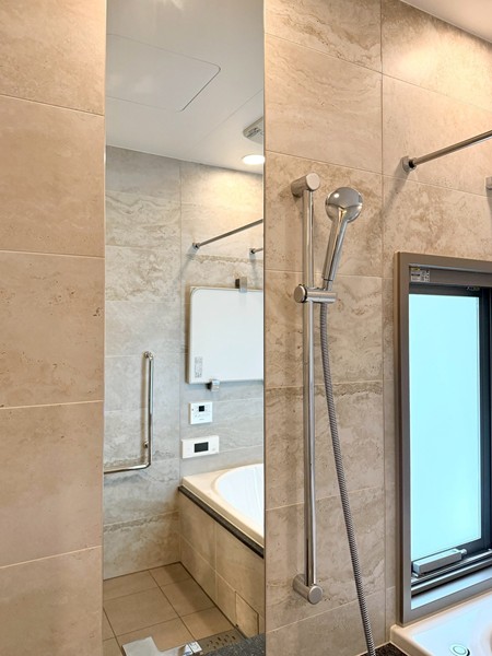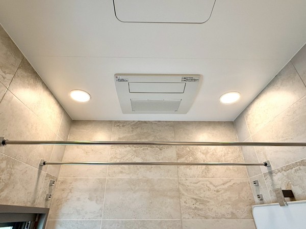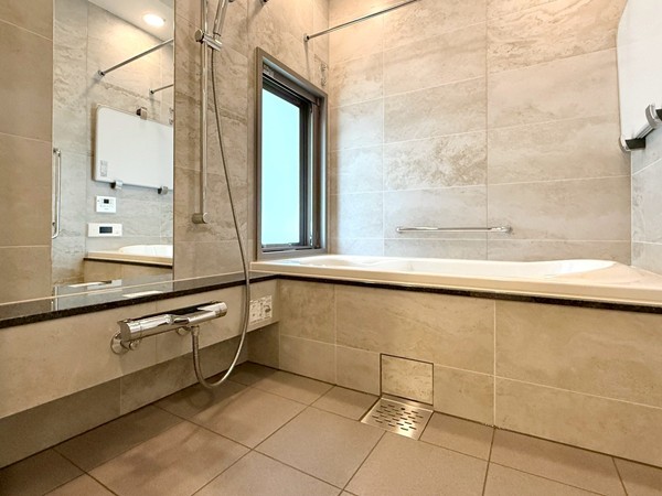 ベージュのストーン調パネルが上質感を演出するバスルーム。追い焚き機能付きのバスタブで、好みの温度をキープしながらゆったりと入浴できます。さらに浴室乾燥機を搭載し、天候を気にせず洗濯物を乾かせるのも嬉しいポイント。