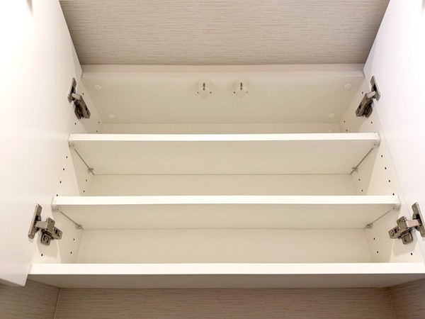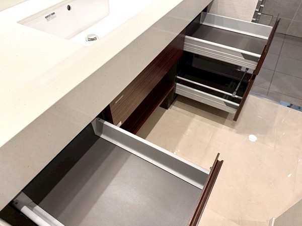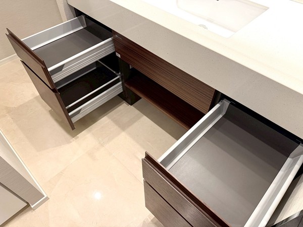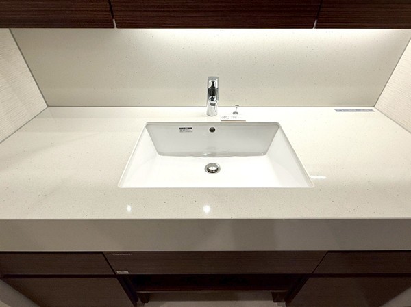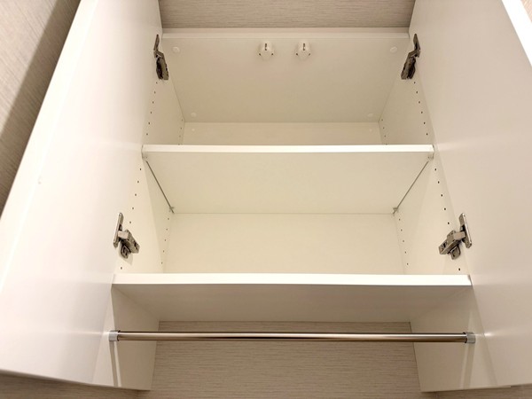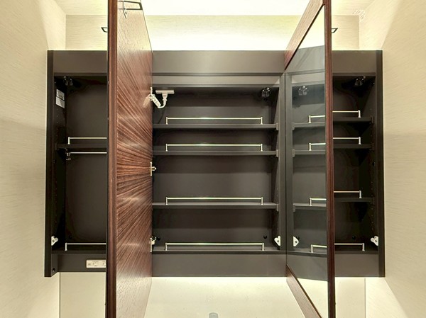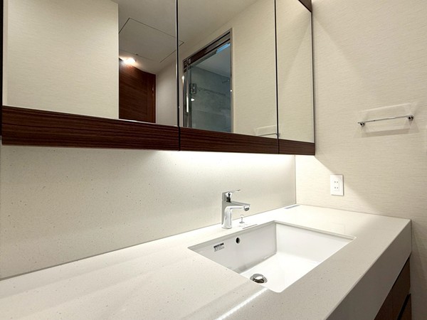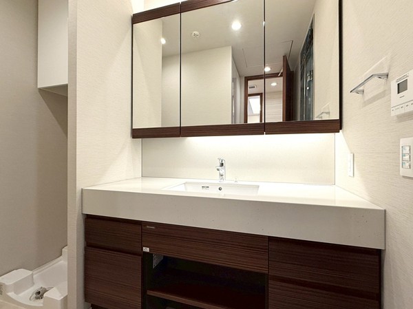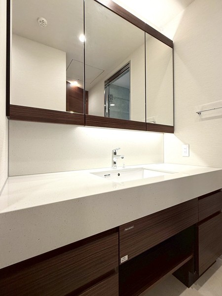 ホワイトを基調としたパウダールームには、ブラウンデザインが映える大きな洗面化粧台を設置。3面ミラー仕様で身支度もしやすく、キャビネット収納も豊富。洗面用品やスキンケアグッズをすっきり整理可能で、水回りを綺麗に保てそうです✧
