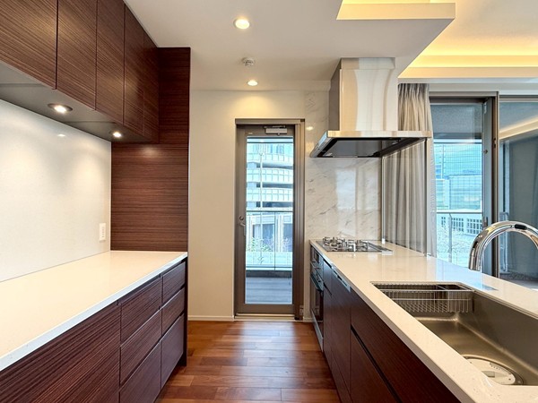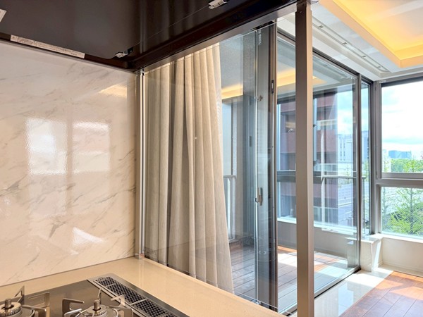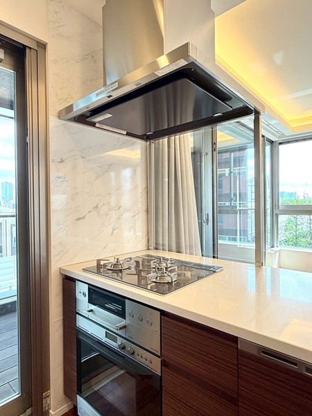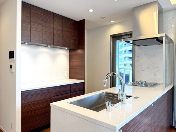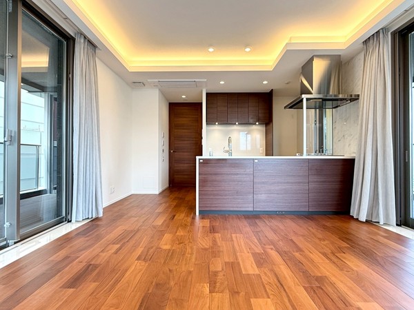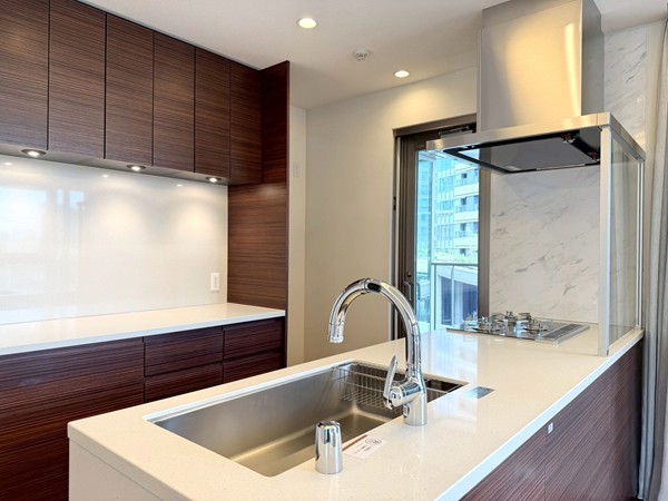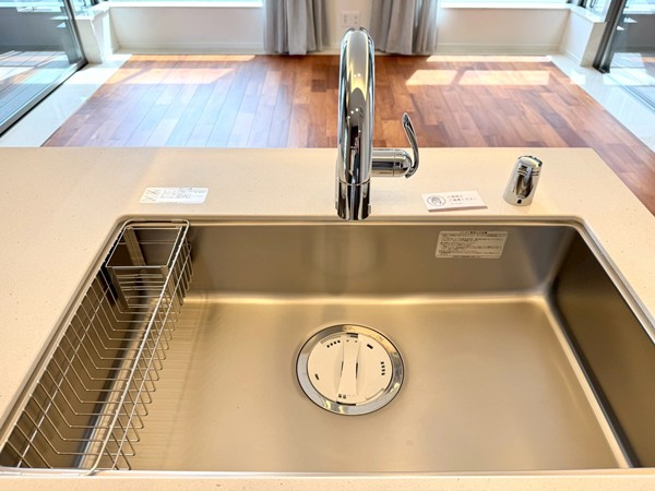 今回ご紹介したのは、5階部分に位置する未入居の専有面積78.14㎡・3LDK+SICの一室です。室内に入ると、まず開放感のあるメインルームが印象的。約16.5帖の広さに加え、天井高は約2.65mとゆとりがあり、3方向に窓が設けられていることで実際の広さ以上に伸びやかに感じられました。床暖房も備わっており、寒い季節には足元からやさしく室内を温めてくれます。キッチンはリビングと一体感のあるオープンタイプ。ご家族やゲストと会話を楽しみながら調理ができ、グリル・オーブンのほか、食洗機やディスポーザーも完備されているため、日々の家事を効率よくサポートしてくれそうです。