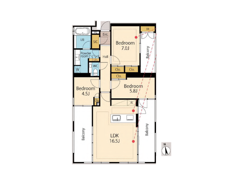 バルコニーは東向きに2カ所、西向きに1カ所の計3カ所を用意。いずれも陽当たりが良く、用途に応じて使い分けができます。約7.0帖の洋室から出入りできるバルコニーにはトランクルームが備わり、季節物などの収納にも重宝しそうですよ。