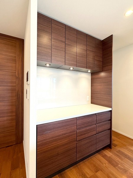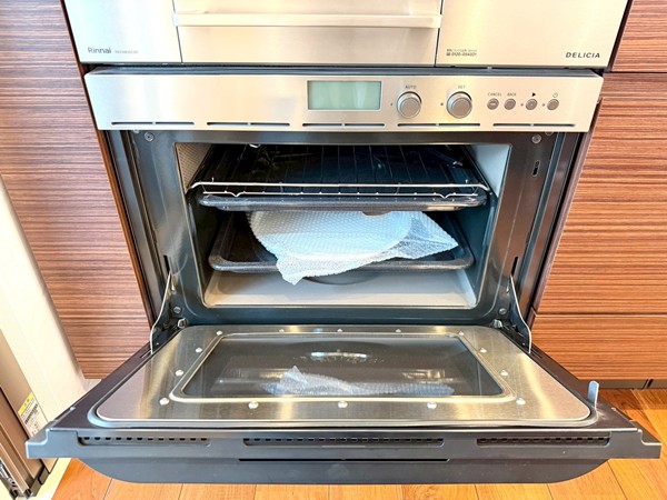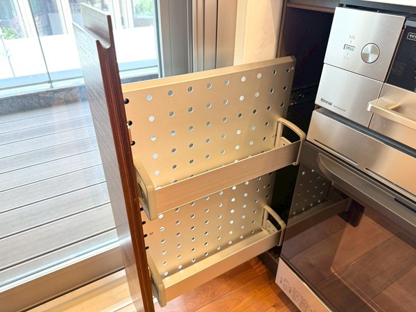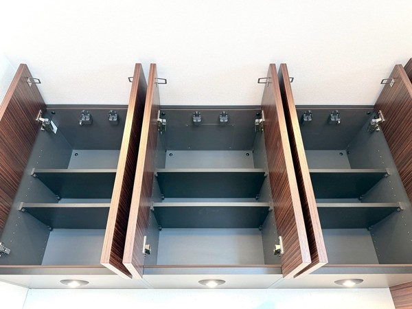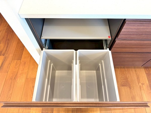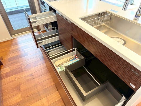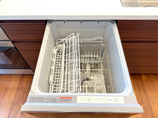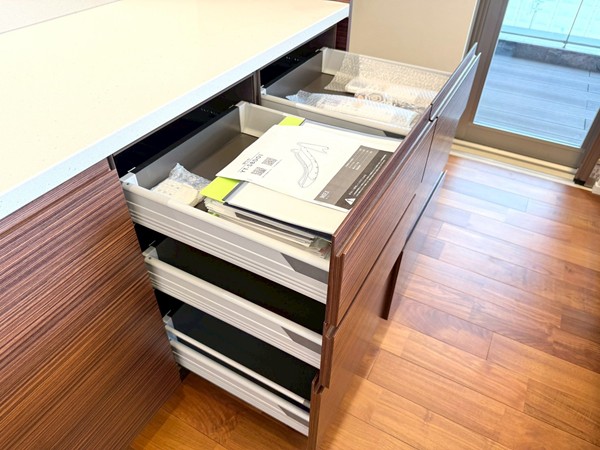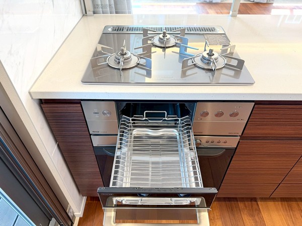 リビングと一体感のあるオープンキッチンを採用。調理中も空間のつながりを感じられる設計で、ご家族やゲストとの会話を楽しみながら作業ができます。開放的なレイアウトのため、配膳や片付けの動線もスムーズに。グリル・オーブンを備えたコンロに加え、食洗機やディスポーザーも完備されており、日々の家事を効率的にサポート。