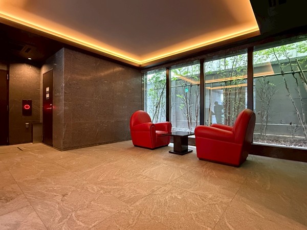 エントランスを進むと、明るく整えられたロビー空間が迎えてくれます。椅子とテーブルが用意されているため、待ち合わせや小休憩にも利用できそう。新築らしい美しさが印象的な共用部でした。