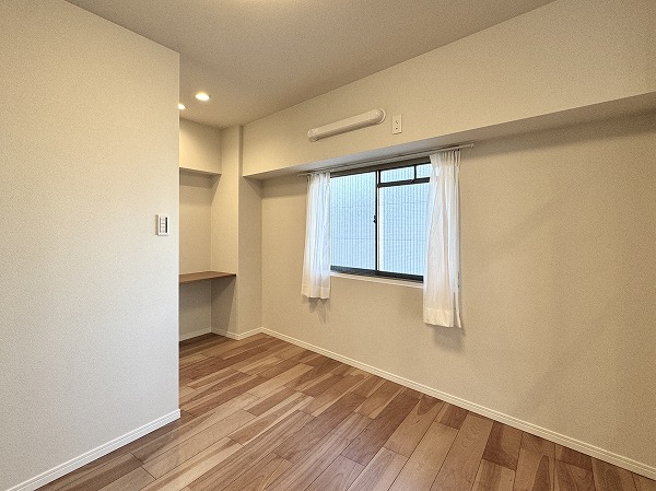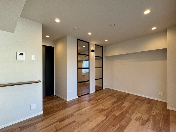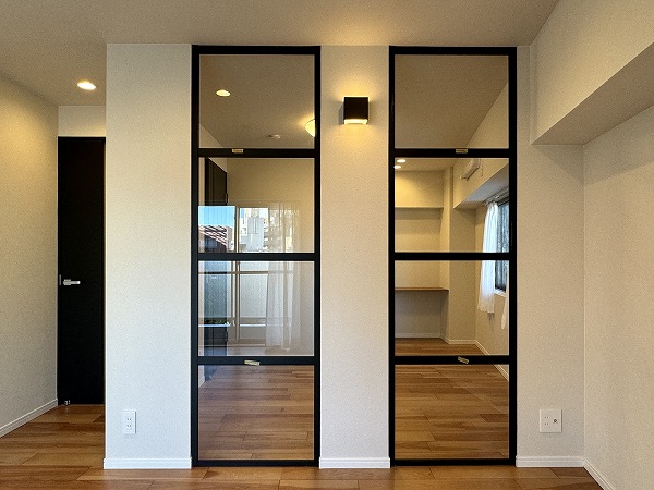 リビングダイニングに隣接する洋室は、約6.1帖の使いやすい広さ。ブラックフレームの室内窓を採用することで、空間にメリハリを与えながらリビングとの一体感を演出しています。さらにバルコニーからの自然光が室内窓を通して洋室にも届き、明るい印象☀