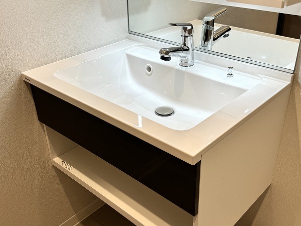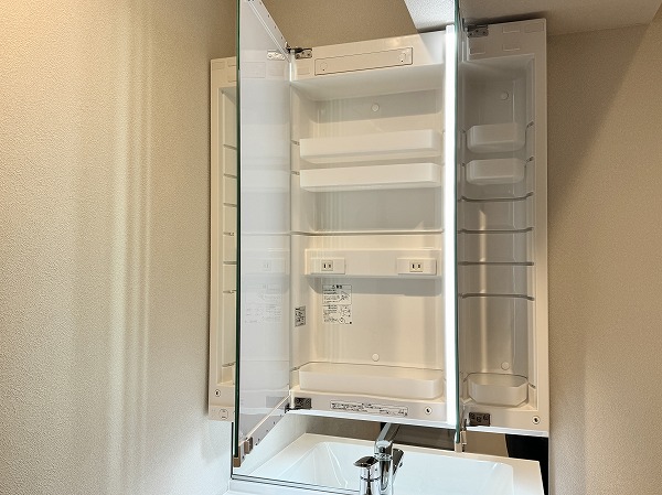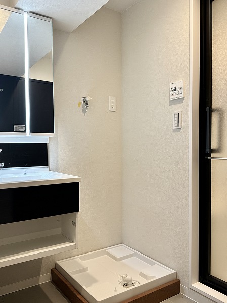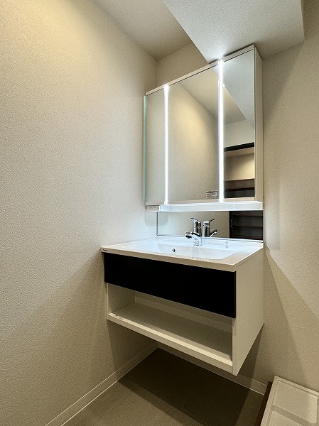 パウダールームには、洗面化粧台と洗濯機置き場、バスルームをまとめた効率的なレイアウトを採用。水まわりの動線がコンパクトに整理され、日々の支度や家事をスムーズにこなせます。洗面化粧台は3面鏡仕様で収納力も十分。フロート施工により足元がすっきりと見え、空間全体に軽やかで洗練された印象を与えていますよ。