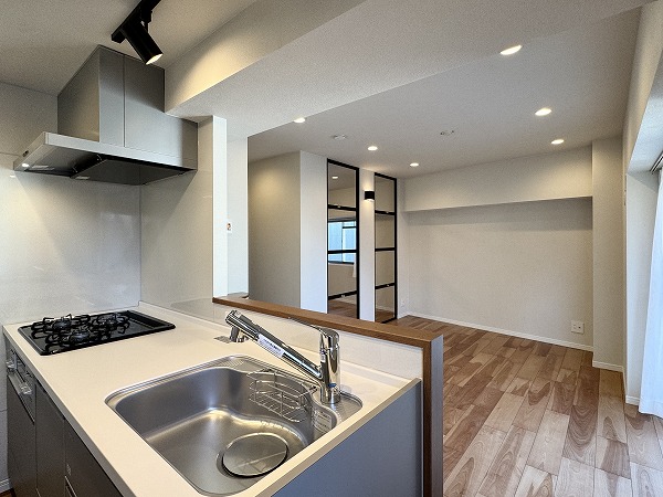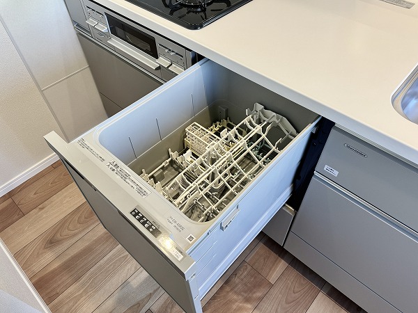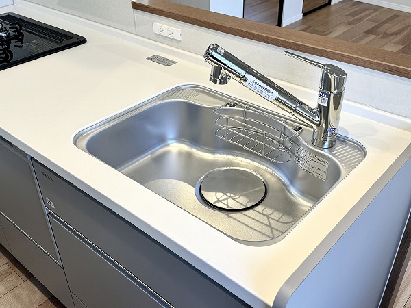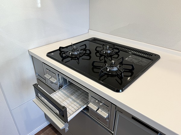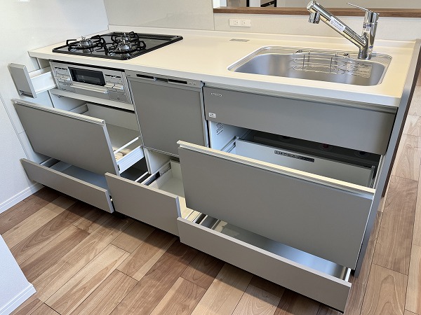 キッチンスペースには、開放感のあるペニンシュラタイプを採用。グレーカラーを基調としたデザインが空間に落ち着きをもたらし、LDK全体を洗練された印象にまとめています。食洗機とグリル付き3口コンロを備え、調理から後片付けまでをスムーズにこなせる、実用性の高いキッチンですよ◎