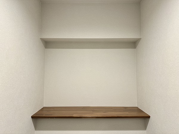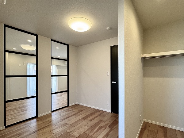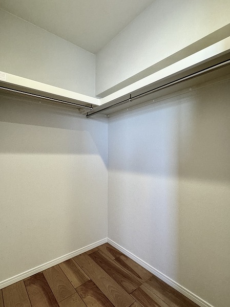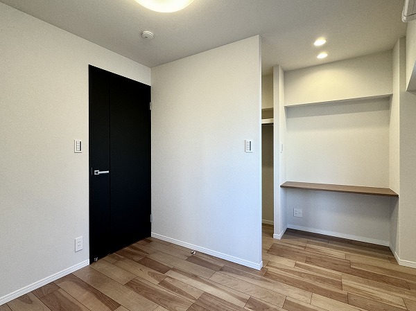 洋室にはオープンタイプのウォークインクローゼットを設置。視線が抜ける設計のため圧迫感が少なく、衣類や小物を効率よく収納できます。その隣にはカウンターを設け、収納と作業スペースを一体で考えた、実用性の高いレイアウトに✦