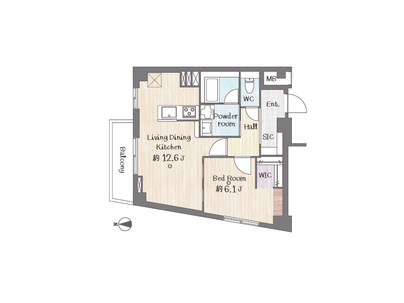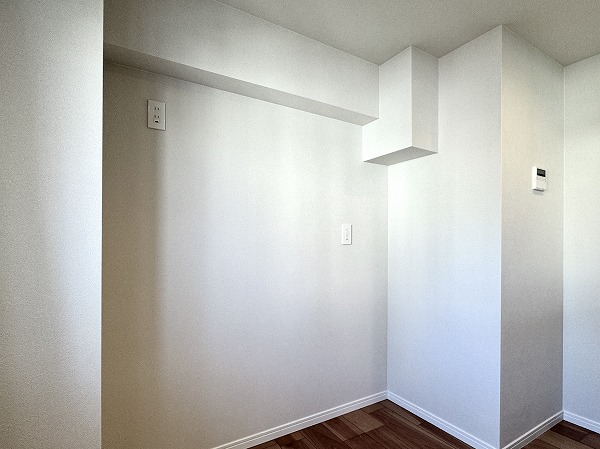 約12.6帖のリビングダイニングキッチンは、お家で過ごす時間の中心となるゆとりある空間。ホワイトを基調とした内装が自然光をやさしく受け止め、フローリングの木目がほどよい温かみを添えています。ソファとローテーブルを置いてくつろぎの場をつくり、窓際には観葉植物やワークデスクを配置するのも良さそう。