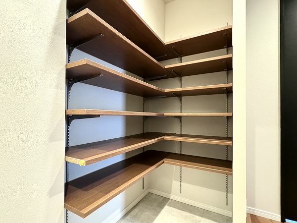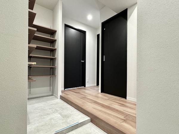 玄関にはゆとりある土間スペースを確保し、住まいの第一印象に余白をもたせた設計。L字型のシューズインクローゼットを備え、収納量を確保しながらも動線をすっきりとまとめています。お気に入りのシューズや小物を“見せる”収納としてお楽しみいただけますよ♩