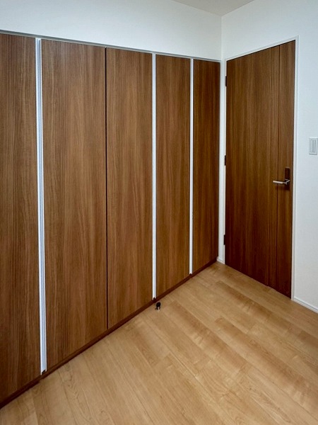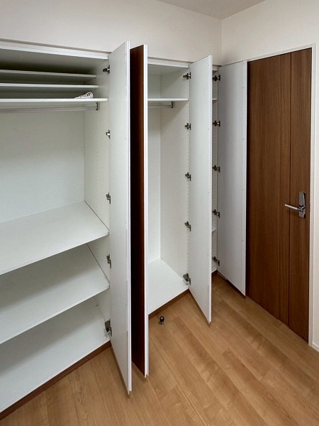 クローゼット内には棚が完備されており、可動式となっています。タンスを中に置かなくても、棚の幅を変えることで、畳む収納・掛ける収納に分けることができますよ。収納の自由度が高まりますね。